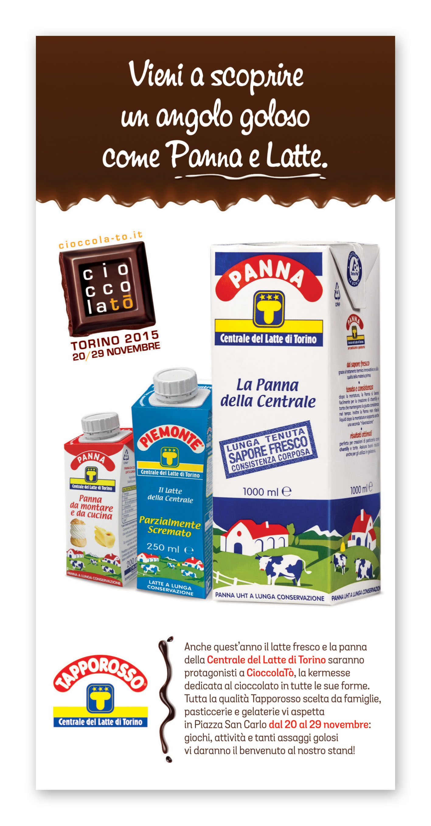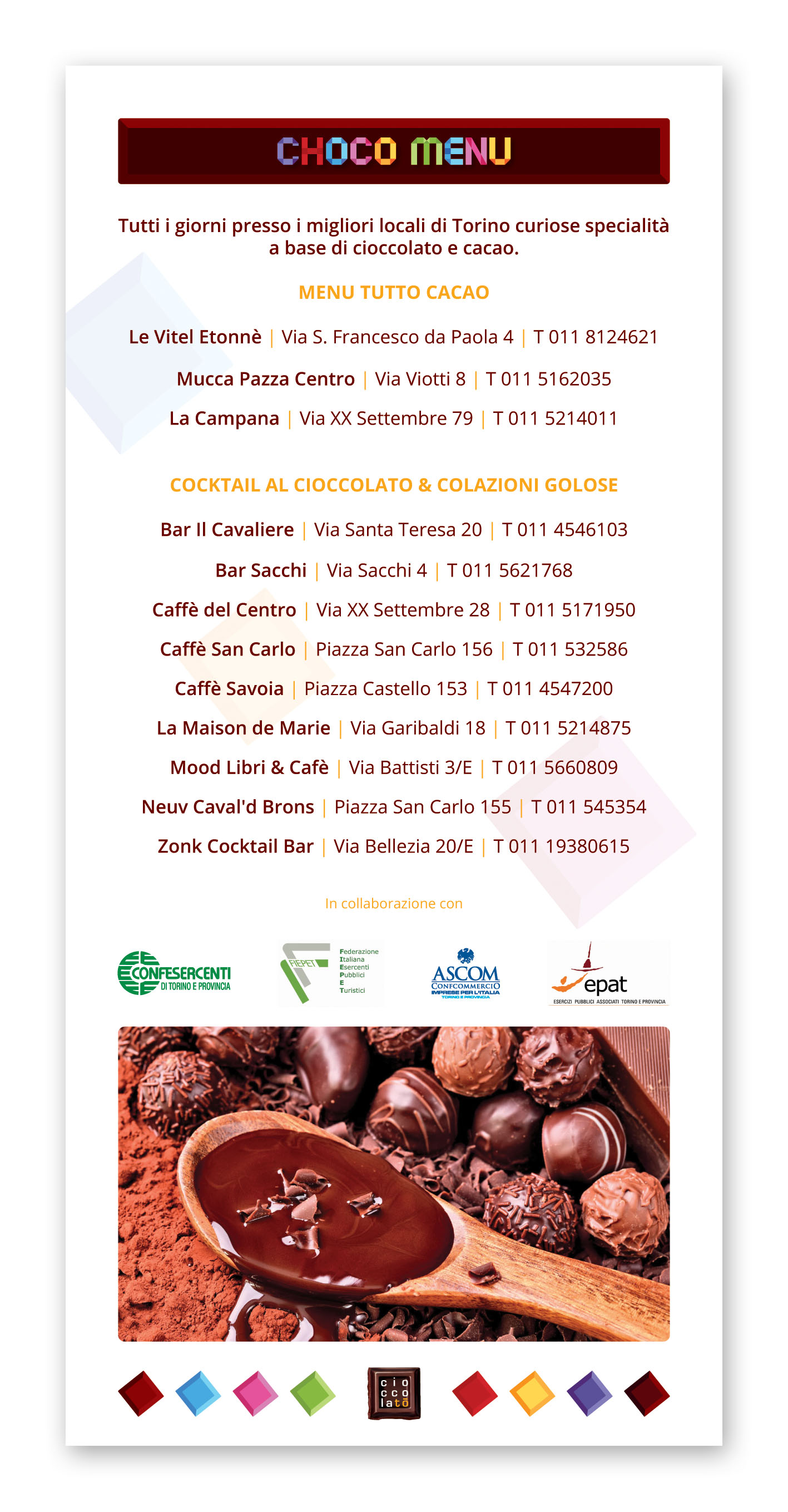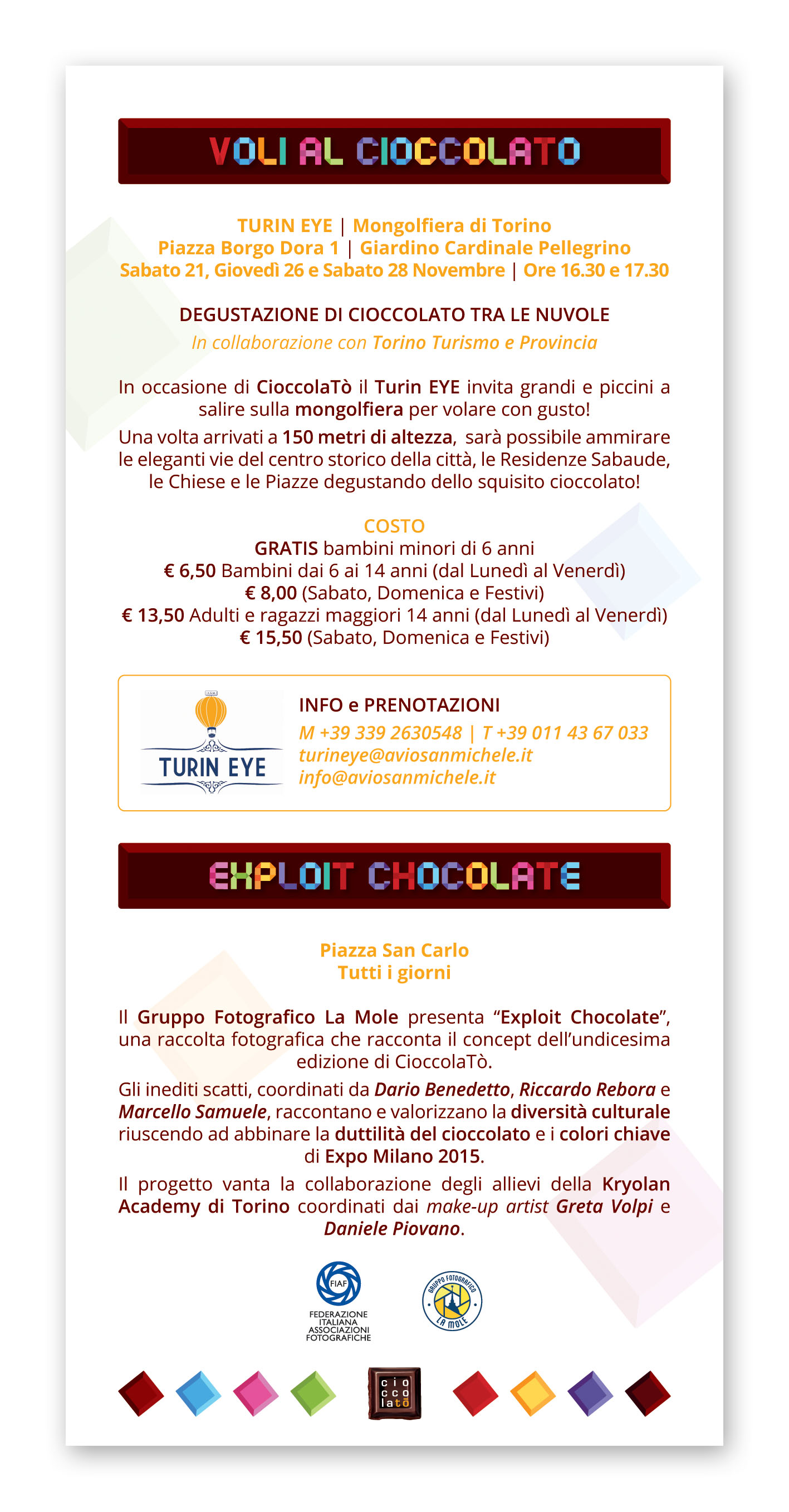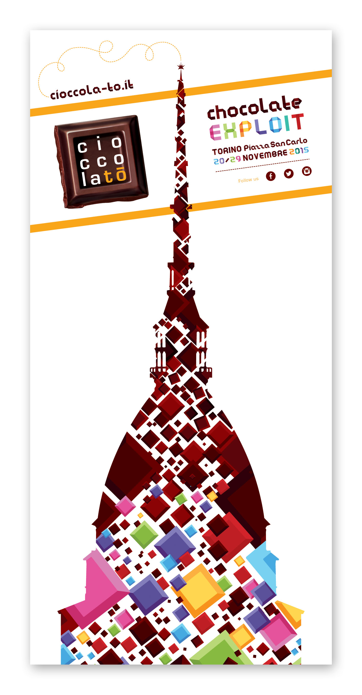 Un’occasione unica per Torinesi e turisti non solo per gustare e per conoscere da vicino il Cibo degli Dei, ma anche per approfondire la tradizione cioccolatiera locale e per lasciarsi coinvolgere dalle tante iniziative proposte: incontri con gli esperti, degustazioni, attività culturali e di animazione, iniziative ludico-didattiche per bambini legate al cioccolato made in Italy ed internazionale. Un vero e proprio Chocolate Exploit, come recita il claim di CioccolaTò 2015, la cui immagine ufficiale interpreta la Mole Antonelliana, attraverso un’esplosione di golosi cubotti di cioccolato che richiamano i colori di Expo Milano 2015, l’Esposizione Universale appena conclusa, che ha visto fra i protagonisti anche la Città di Torino, presente nel padiglione dei Distretti Italiani del Cioccolato.