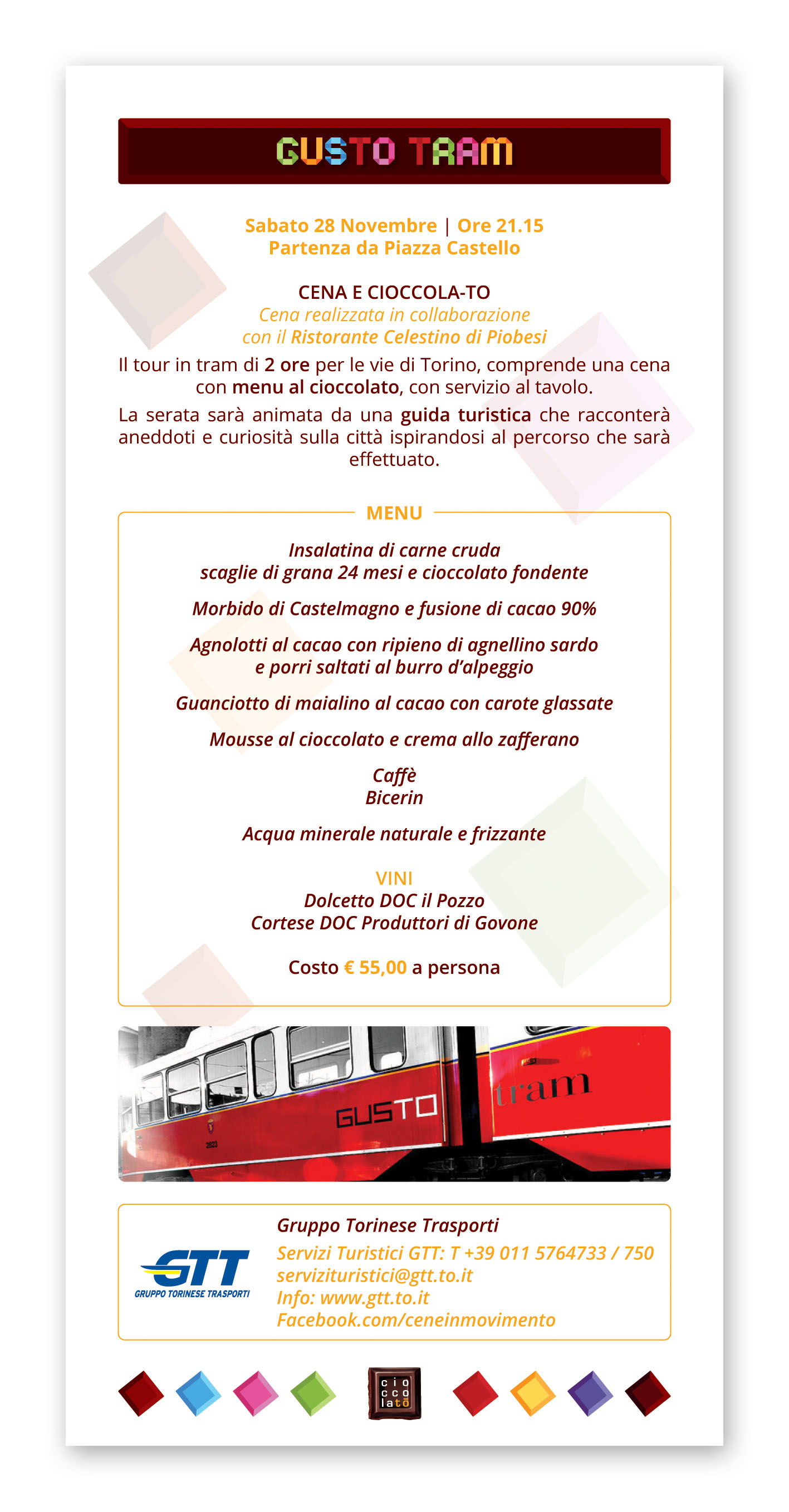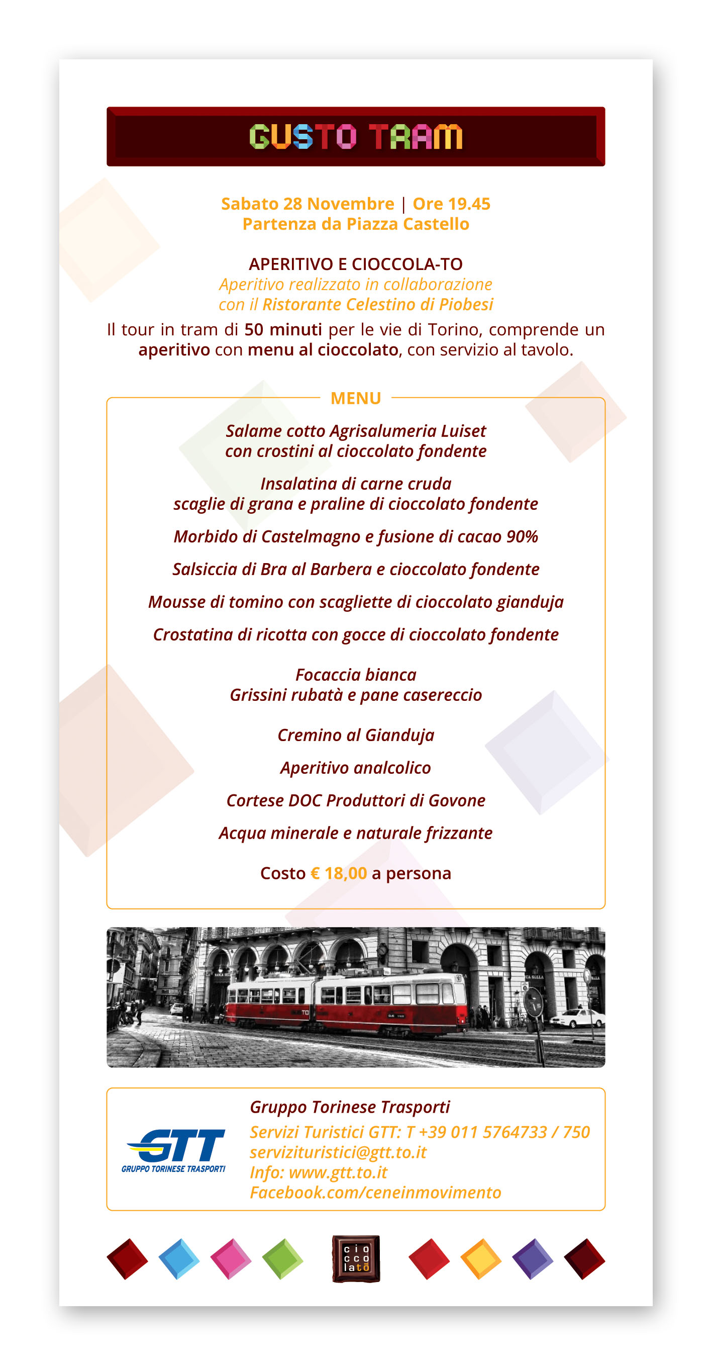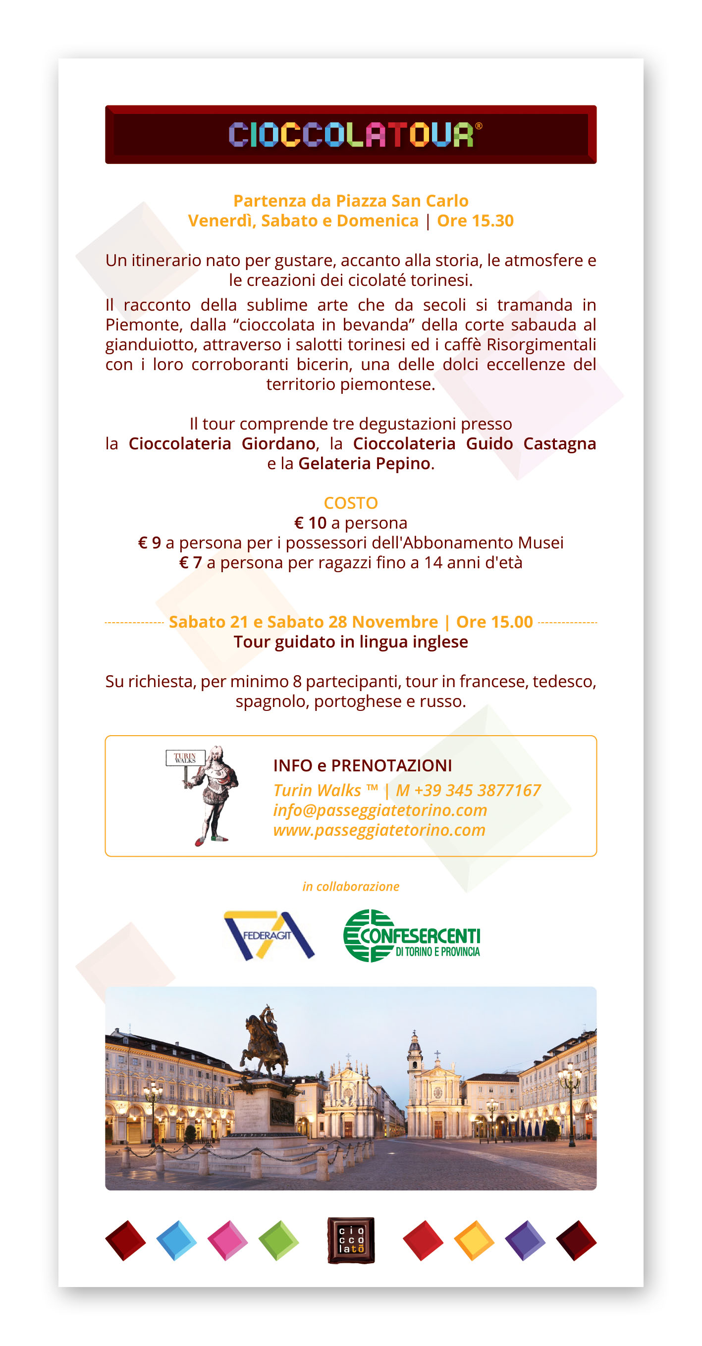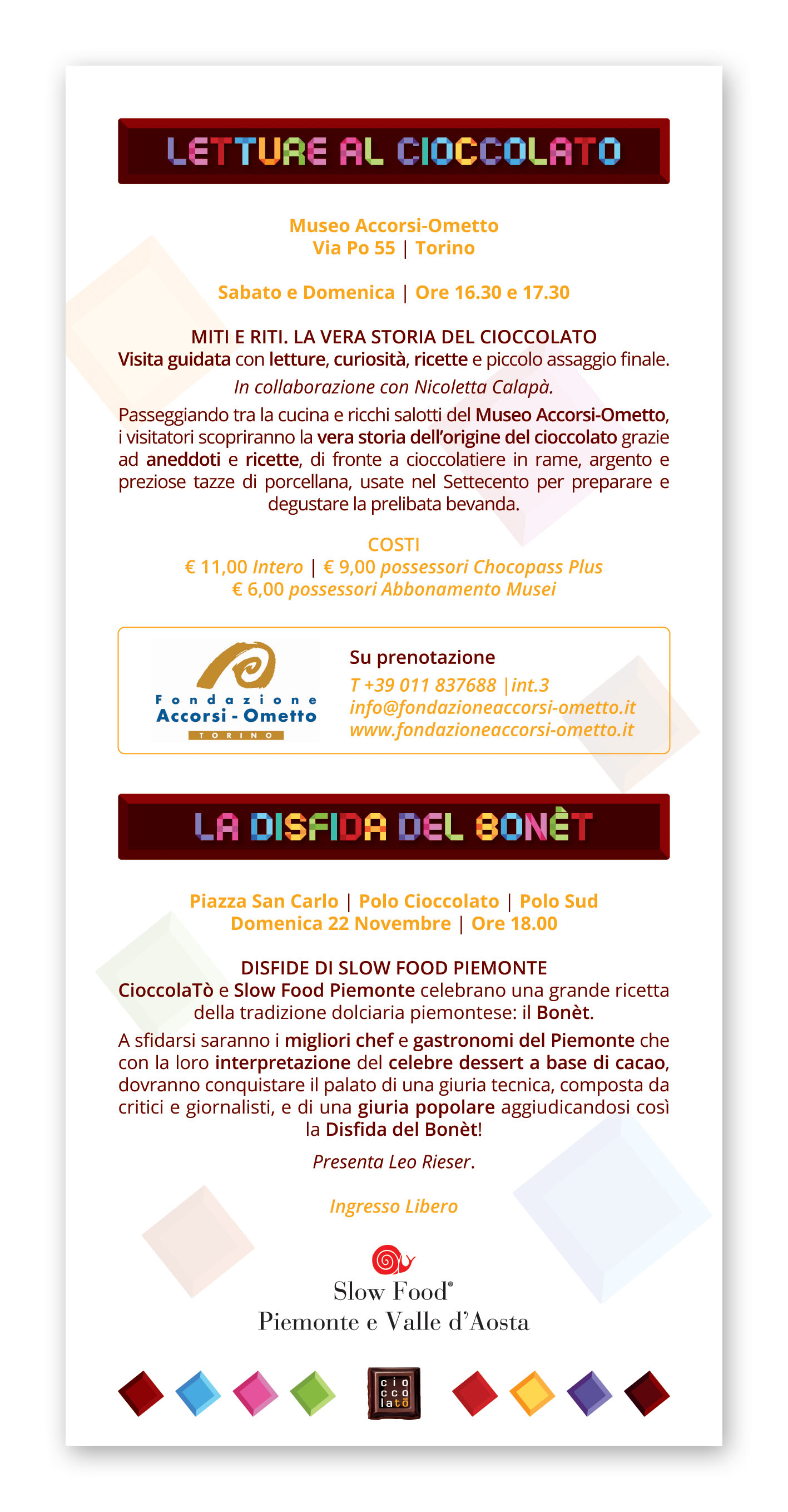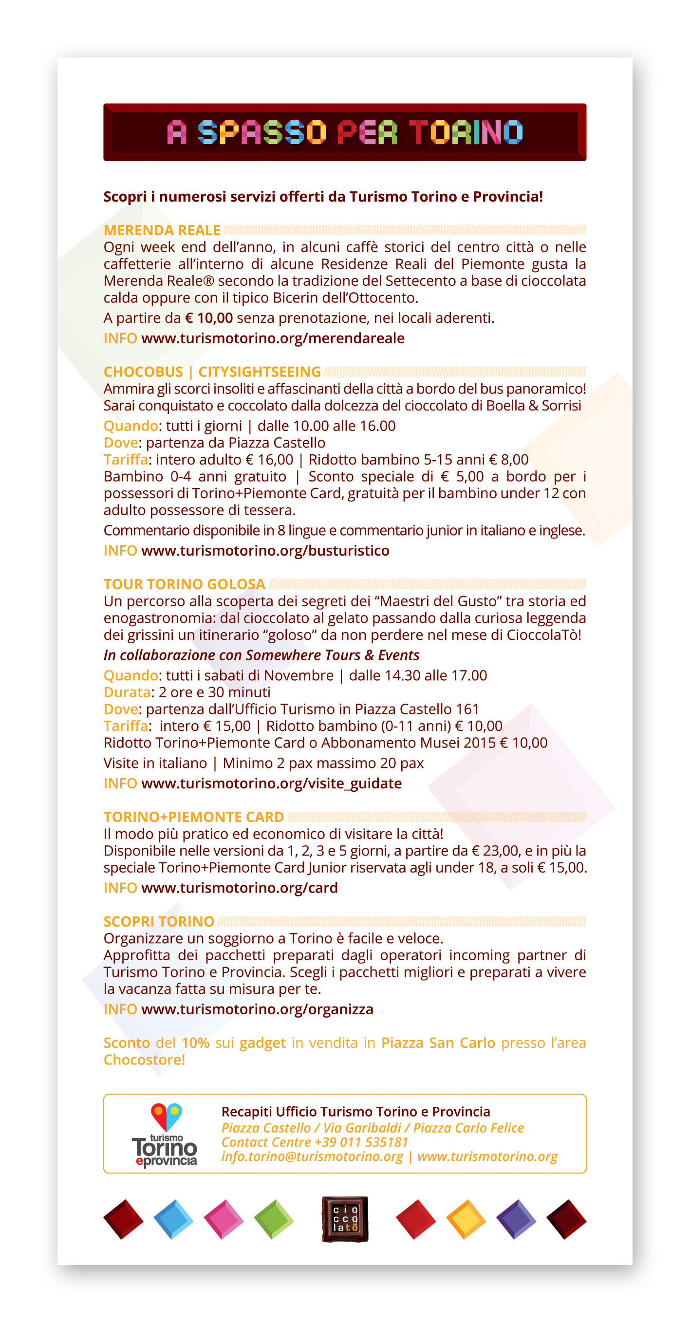 Un’occasione unica per Torinesi e turisti non solo per gustare e per conoscere da vicino il Cibo degli Dei, ma anche per approfondire la tradizione cioccolatiera locale e per lasciarsi coinvolgere dalle tante iniziative proposte: incontri con gli esperti, degustazioni, attività culturali e di animazione, iniziative ludico-didattiche per bambini legate al cioccolato made in Italy ed internazionale. Un vero e proprio Chocolate Exploit, come recita il claim di CioccolaTò 2015, la cui immagine ufficiale interpreta la Mole Antonelliana, attraverso un’esplosione di golosi cubotti di cioccolato che richiamano i colori di Expo Milano 2015, l’Esposizione Universale appena conclusa, che ha visto fra i protagonisti anche la Città di Torino, presente nel padiglione dei Distretti Italiani del Cioccolato.