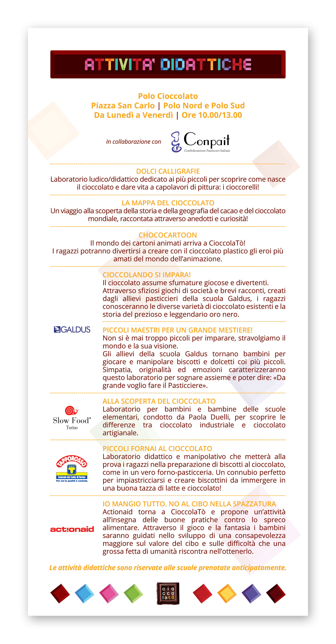 Il Polo Cioccolato, che attende i visitatori nella suggestiva location di Piazza San Carlo, si conferma dolce centro della kermesse, con una ricca proposta di attività gestite e coordinate da Conpait, Confederazione Pasticceri Italiani. Il Presidente, Federico Anzellotti, il delegato regionale Alessandro Del Trotti e la famosa Cake Designer torinese, Elena Bosca sono alcune delle importanti presenze che si alterneranno alla guida dei laboratori di pasticceria, per insegnare ai partecipanti a realizzare facili e cioccolatose ricette dal gusto irresistibile. Grazie alla collaborazione con AIC, Associazione Italiana Celiachia, sezione Piemonte – Valle d’Aosta, che per la prima volta fa il suo ingresso nella kermesse, sarà possibile scoprire tutto il gusto del senza glutine partecipando ai laboratori di pasticceria Gluten Free per adulti. Ad animare il Polo Cioccolato, anche raffinate degustazioni proposte dalle maggiori firme del settore cioccolatiero italiano e piemontese in particolare, e coinvolgenti attività ludico didattiche riservate alle scuole.